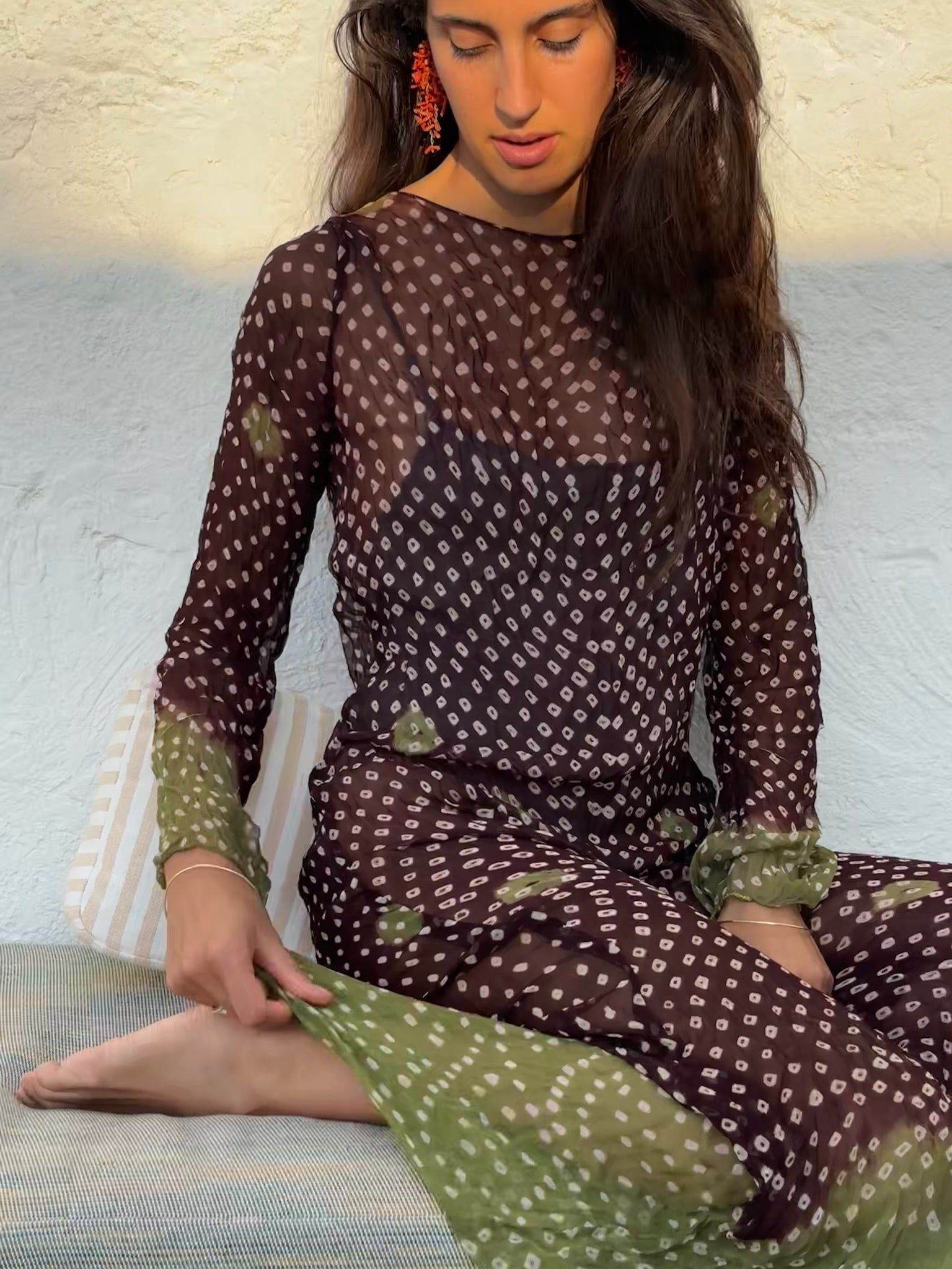 Each piece is created by making tiny knots in the chiffon fabric, which is then hand-dyed for a unique outcome every time. The fabric is then twisted to add a crinkle texture that moulds the dress to the body.