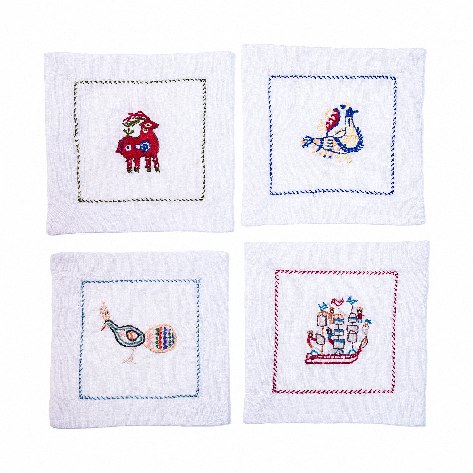 Add a touch of whimsy to your next gathering with this exquisite set of four hand-embroidered cocktail napkins. Crafted from soft white linen, each napkin blends the timeless beauty with a modern, sophisticated aesthetic.