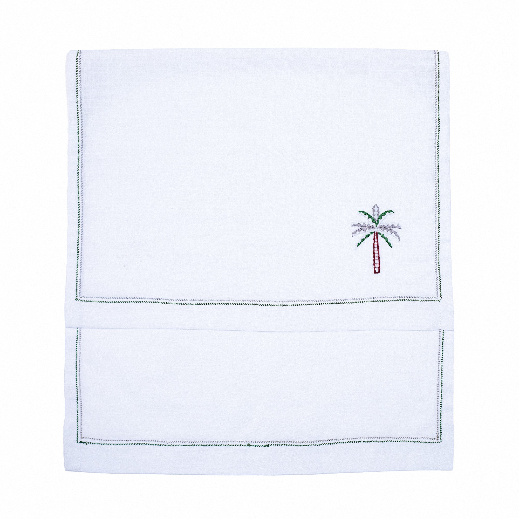Add a touch of elegance and heritage to your kitchen or bathroom with this hand-embroidered hand towel. Made from soft, high-quality linen featuring a beautifully stitched palm tree in the bottom right corner, framed by a subtle green border.